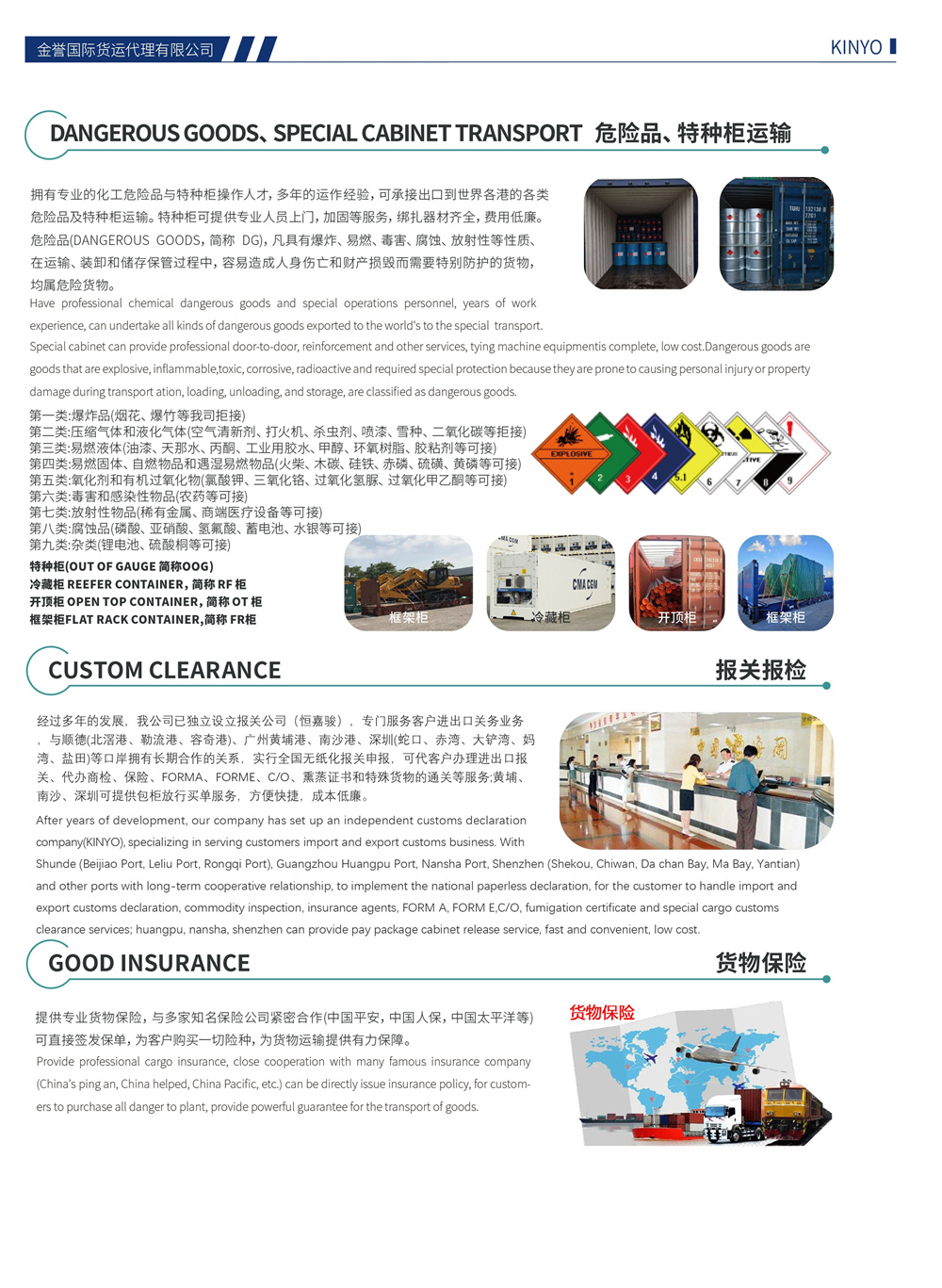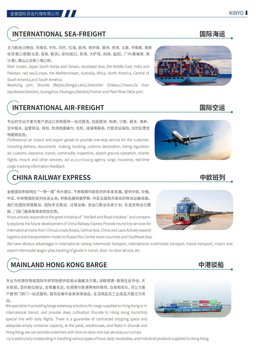 FOSHAN SHUNDE KINYO INT'L TRANSPORTATION CO., LTDwas founded in 2011, is located in SHUNDE beijiao port. Our company is approved by the ministry of commerce of the level of international freight enterprise, registered capital of RMB 5 million. Main business: import and export(FCL/LCL) international shipping, international air freight/courier, international multimodal transport, CR Railway, China-Hong Kong barge, warehousing, customs declaration and inspection, cargo insurance; Proprietary and agents of all kinds of goods and technology import and export business, commodity information consulting services and other integrated services.