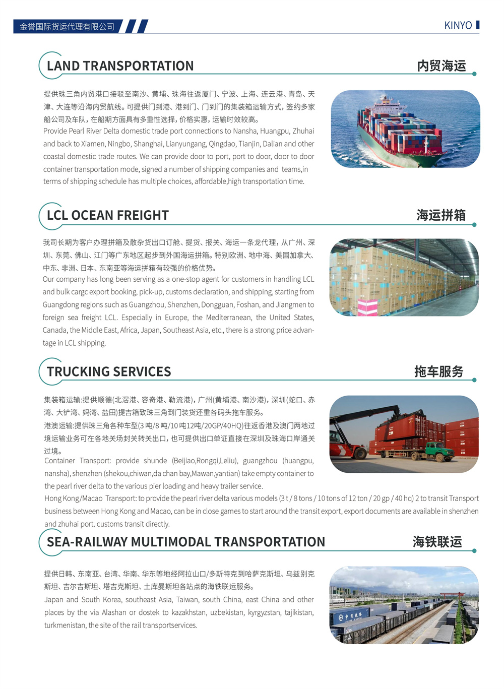 Company since its inception has been committed to providing a full range of one-stop quality modern logistics services for the society and customers, is willing to work with customers hand in hand to creat a better tomorrow, FOSHAN SHUNDE KINYO INT'L TRANSPORTATION CO., LTD will be your closest business partners!
