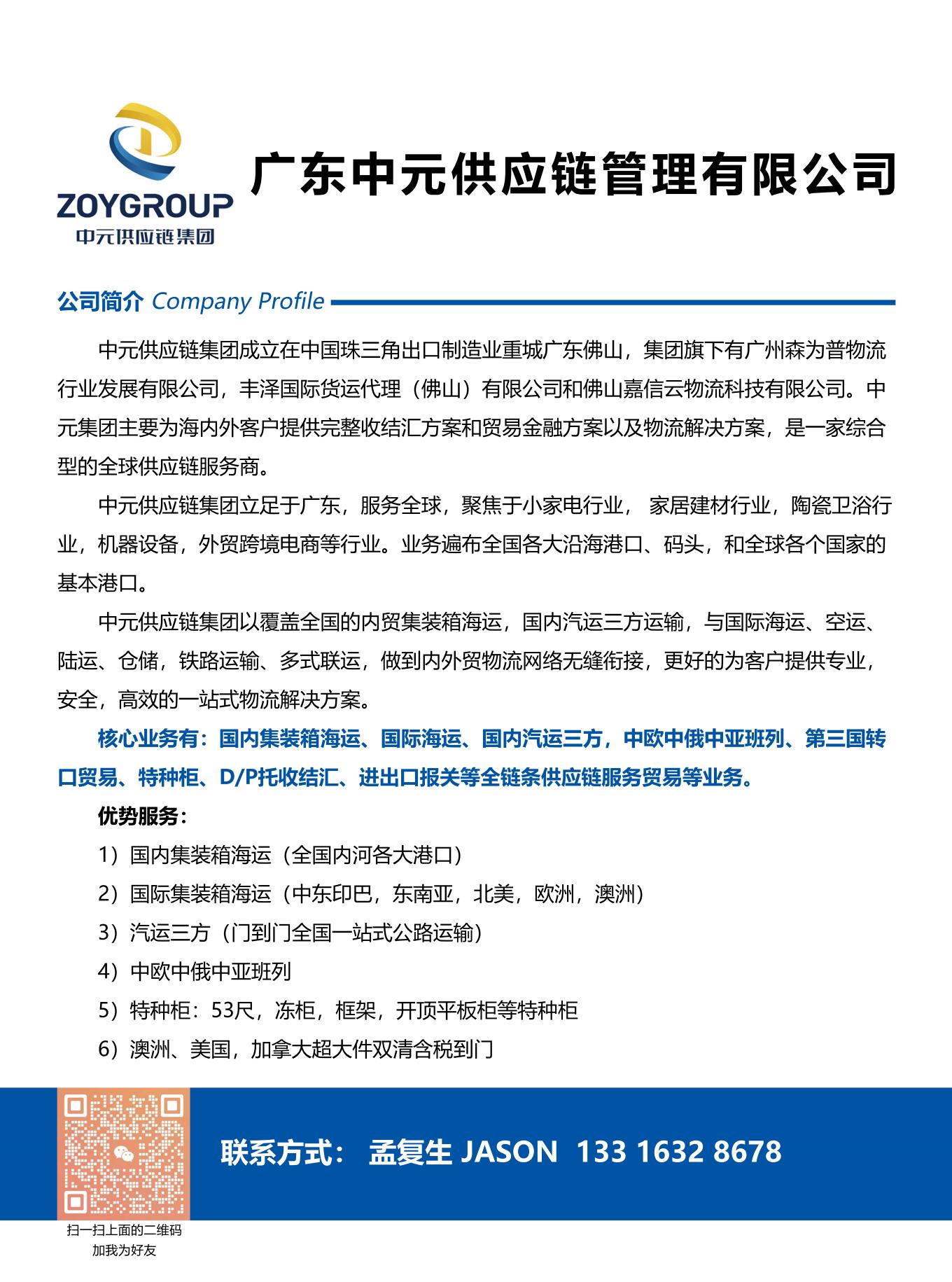 广东中元供应链管理有限公司 2024-05-12 佛山市顺德区跨境货运代理协会 上一条顺德跨境货运代理协会会员名册 下一条【政企联动 助力跨境出海】顺德区委常委、统战部部长梁伟沛带队莅临顺德跨境货运代理协会副会长单位—深圳市八方供应链综合服务有限公司!